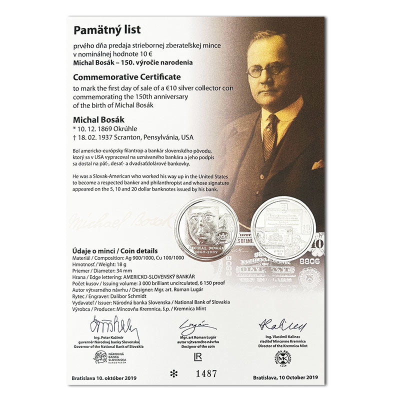 Pamätný list 10 EURO/2019 - Michal Bosák - 150. výročie narodenia