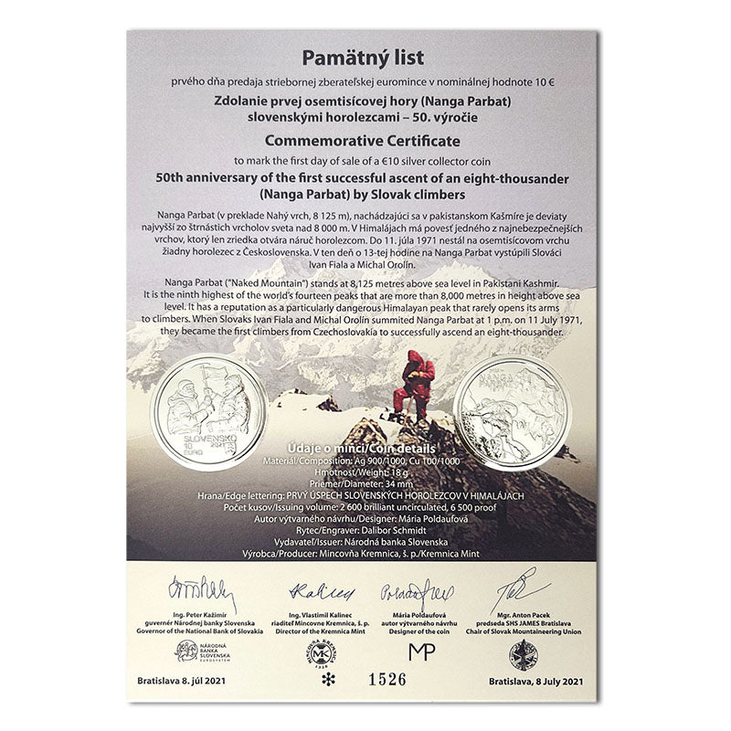 Pamätný list 10 EURO/2021 - Zdolanie prvej osemtisícovej hory Nanga Parbat slovenskými horolezcami - 50. výročie