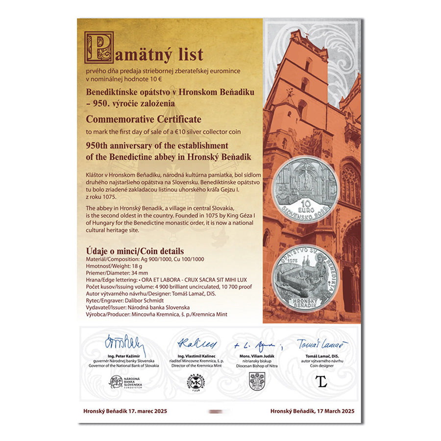Pamätný list 10 EURO/2025 - Benediktínske opátstvo v Hronskom Beňadiku - 950. výročie založenia