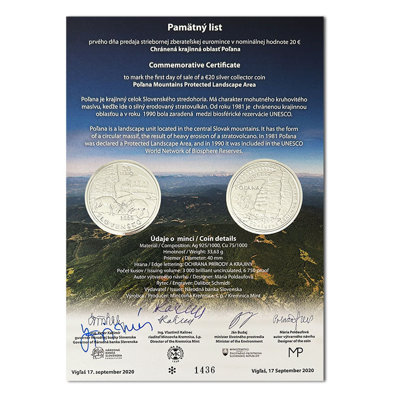 Pamätný list prvého dňa predaja striebornej zberateľskej mince nominálnej hodnoty 20 euro s motívom 'Poľana - chránená krajinná oblasť''.