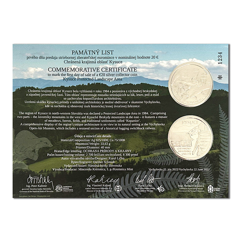 Pamätný list prvého dňa predaja striebornej zberateľskej mince nominálnej hodnoty 20 euro s motívom Kysuce, chránená krajinná oblasť''.